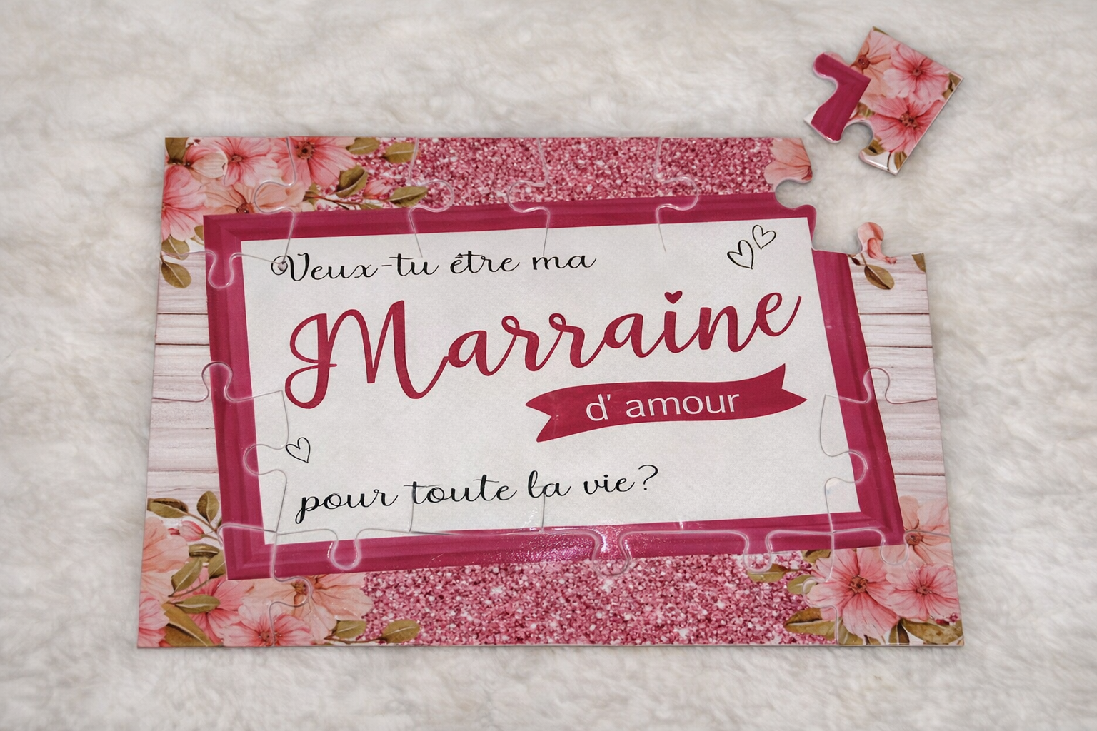 Un texte doux, imprimé au centre du puzzle, entouré d’un cadre fleuri et scintillant.