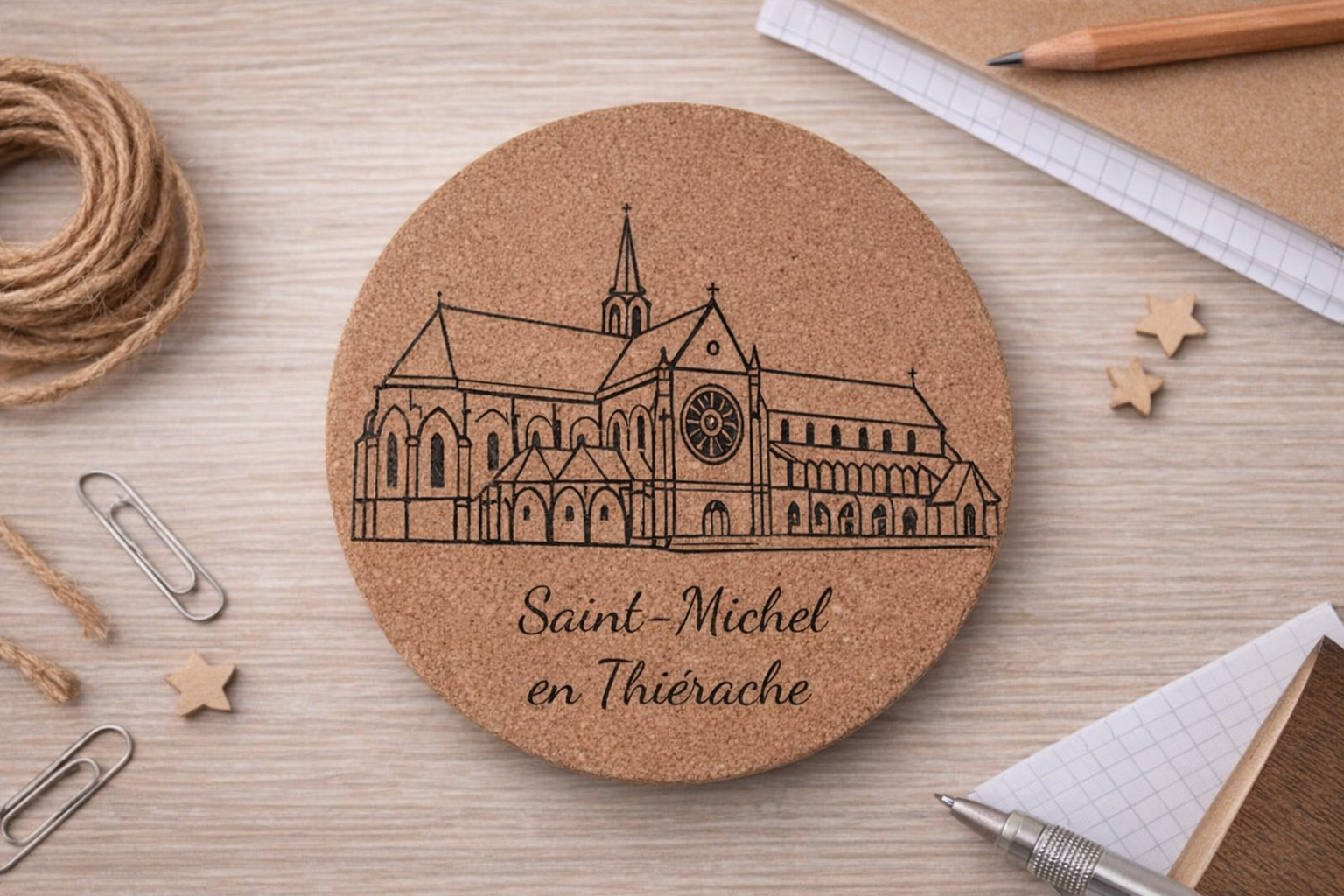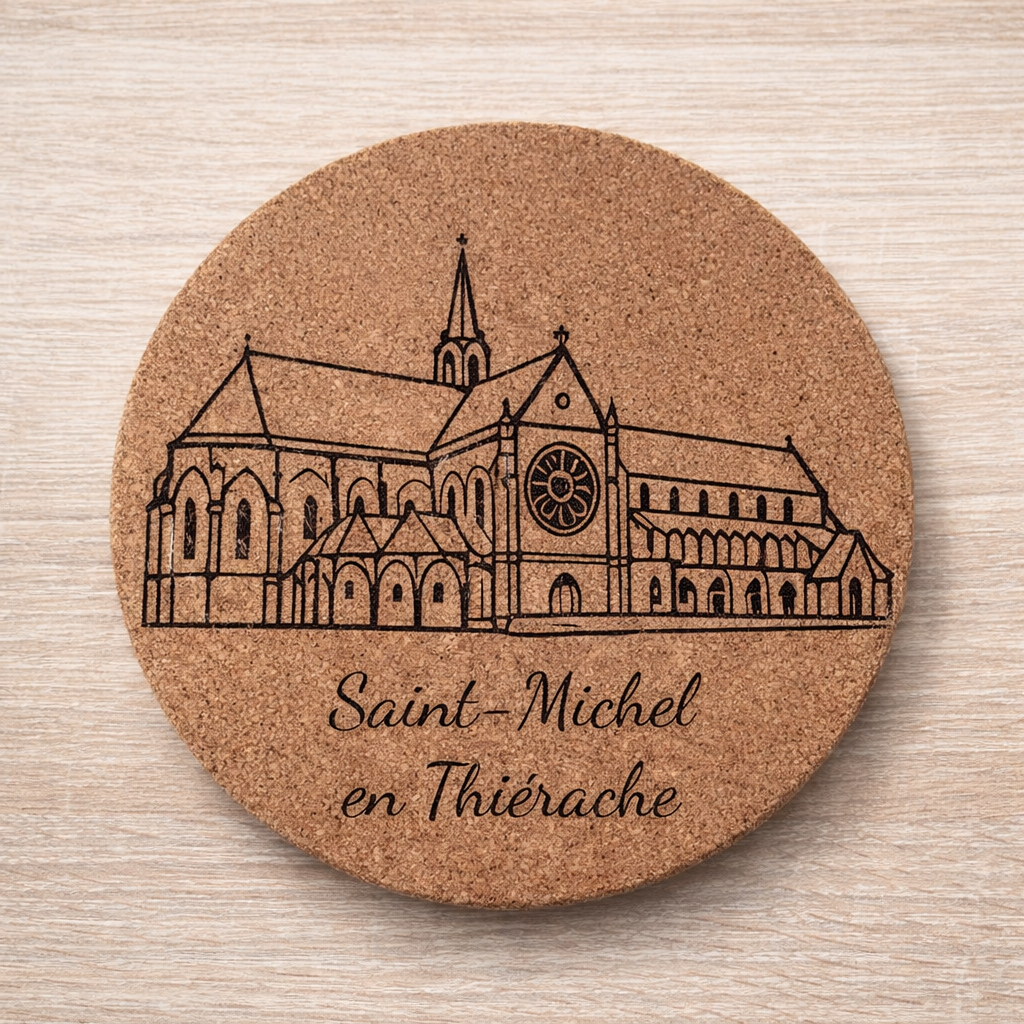 Ce dessous de verre rond en liège naturel est un objet à la fois utile et décoratif, parfait pour mettre en valeur un visuel gravé avec finesse. Le modèle présenté rend hommage à l’Abbaye de Saint-Michel en Thiérache, avec une illustration architecturale fine et élégante.