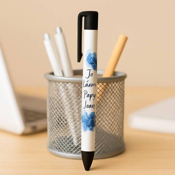 Stylos à bille personnalisables selon les envies du client : petit texte, prénom, logo, motif imprimé, message court… Chaque stylo est décoré sur commande, pour un rendu unique et soigné.